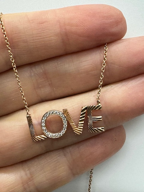 The Milo LOVE necklace is an elegant and sophisticated piece that every woman needs in her collection. Featuring our signature fluted texture with round diamonds encrusted on the second letter "O", this necklace exudes luxury and beauty both at once.