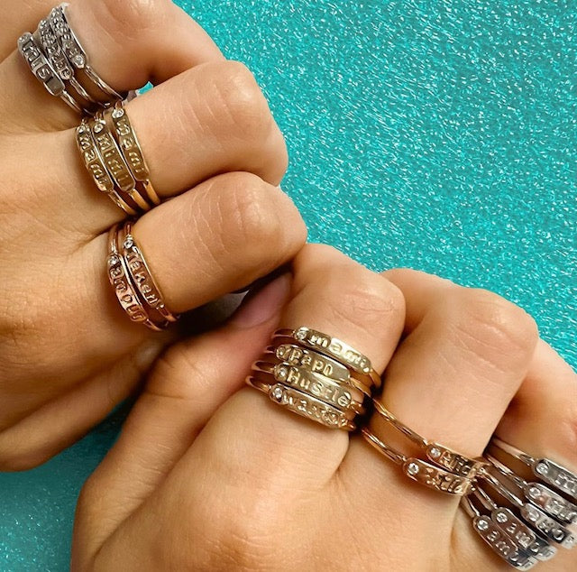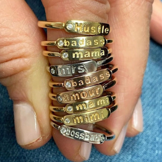 The Twiggy Mama Ring is a fun, modern band with a thin profile and a round diamond, and the word "mama" in lower case lettering. Wear it alone or stack it with favorites. This is a great gift for any mama in your life, and at any point in her motherhood journey!