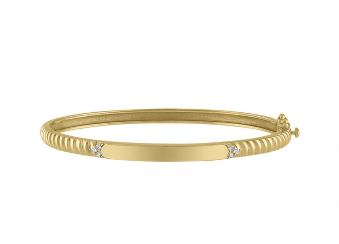 The perfect bangle to add to your wrist stack. Featuring our signature fluted design, this bracelet incudes six diamonds on either side of a center plate, perfect for personalizing and engraving names, dates or special messages.