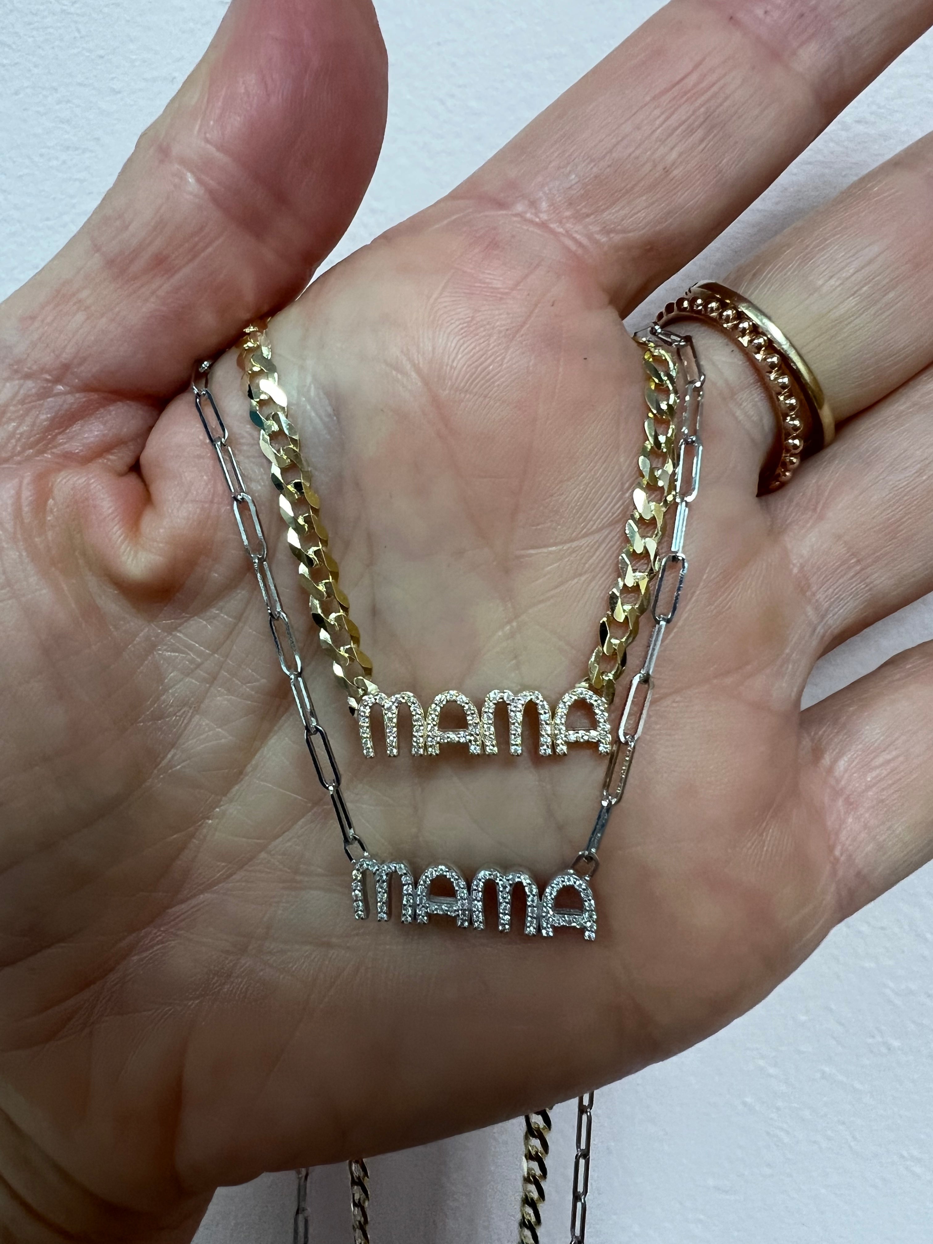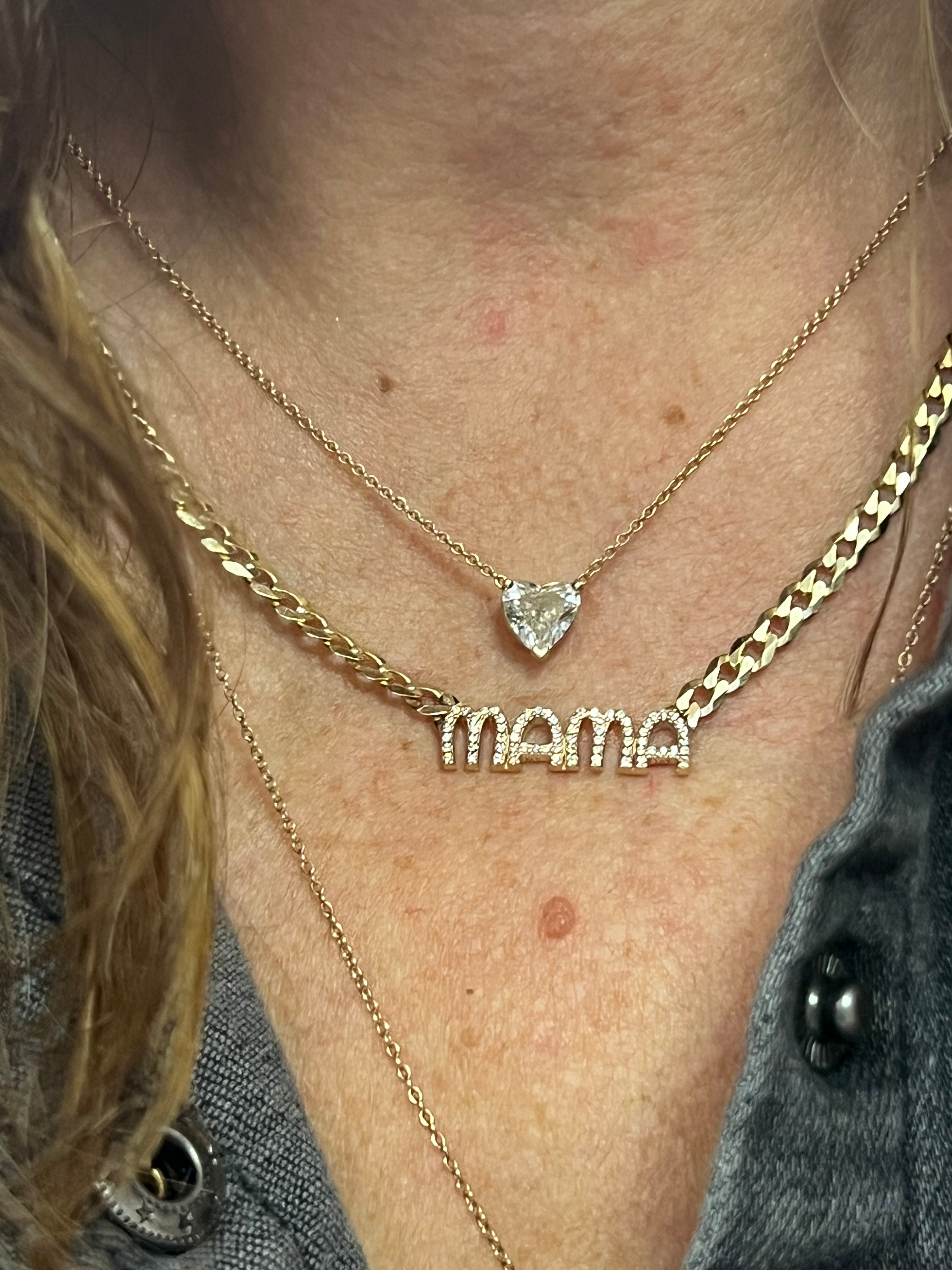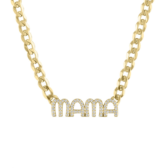 The Milla Wren necklace on a Cuban link chain takes this style to the next level. Get the glamorous edge you crave with its Mama mantra in all diamonds. Add a touch of glitz to your get up and make them do a double take!