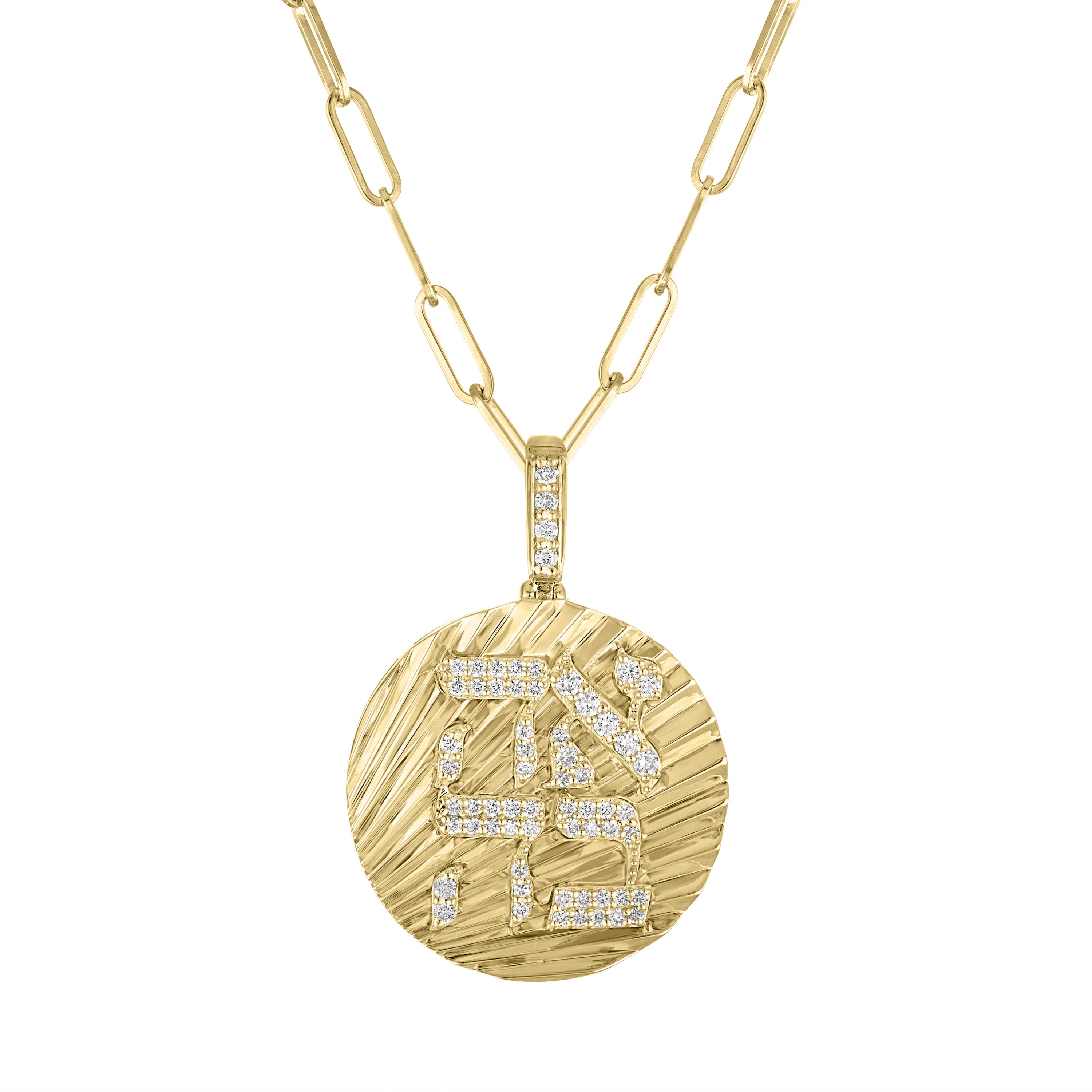 A perfect disc, full of love, featuring our signature fluted design and the word Ahava אהבה (love in Hebrew) in dazzling diamonds across the front. Crafted in gleaming 14K gold, with a hint of sparkle, representing the light and warmth that love brings into our lives. This piece is meant to be worn everyday, close to your heart.