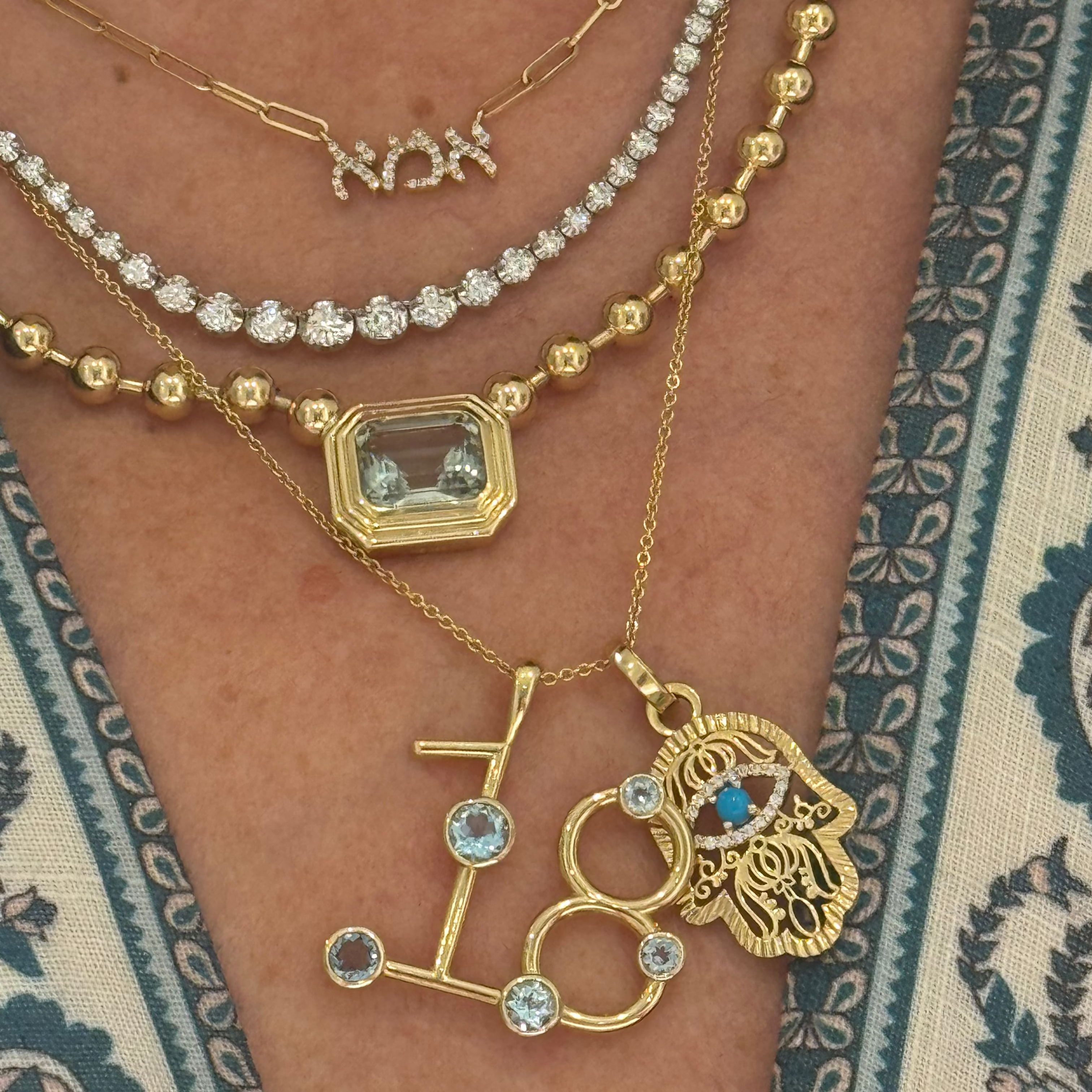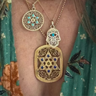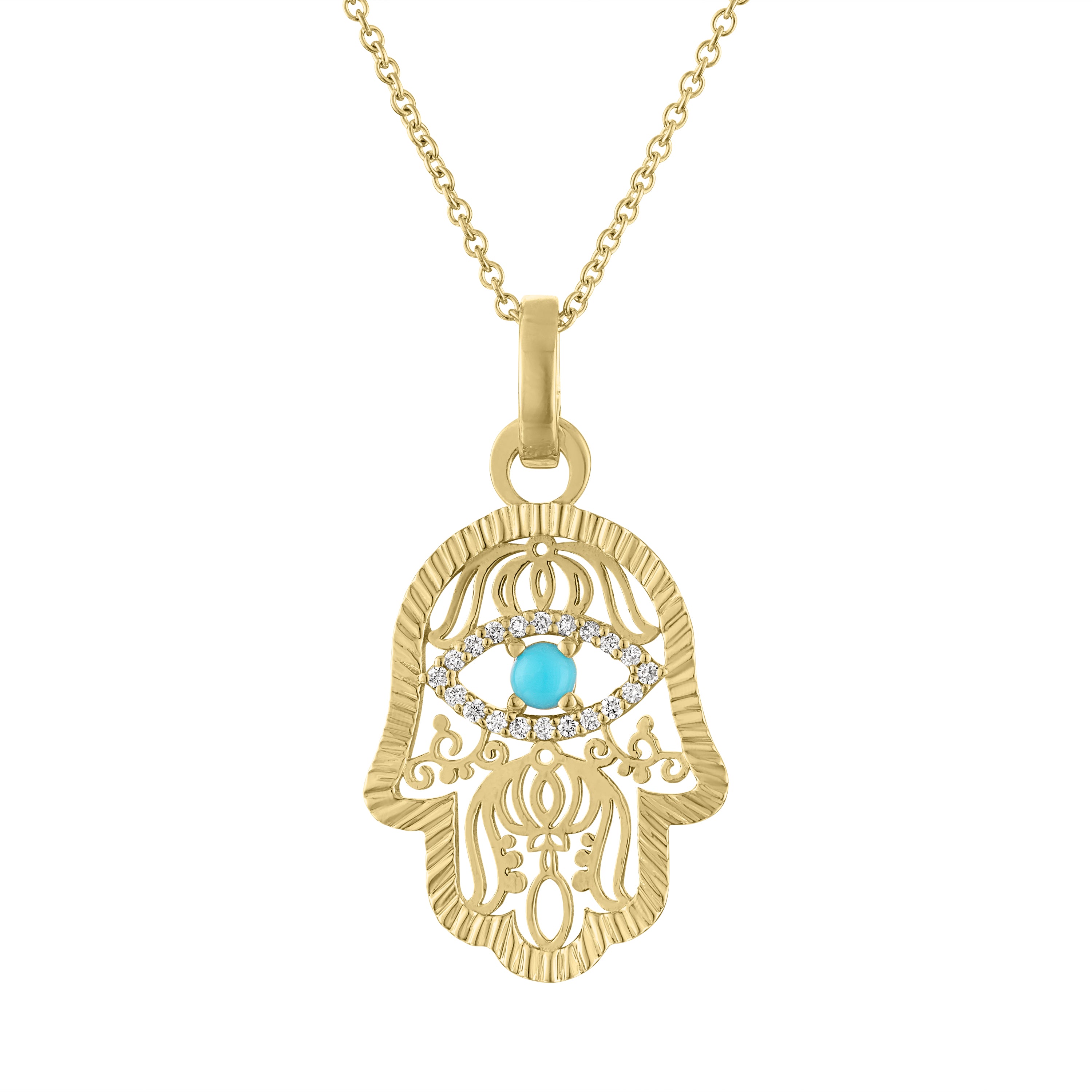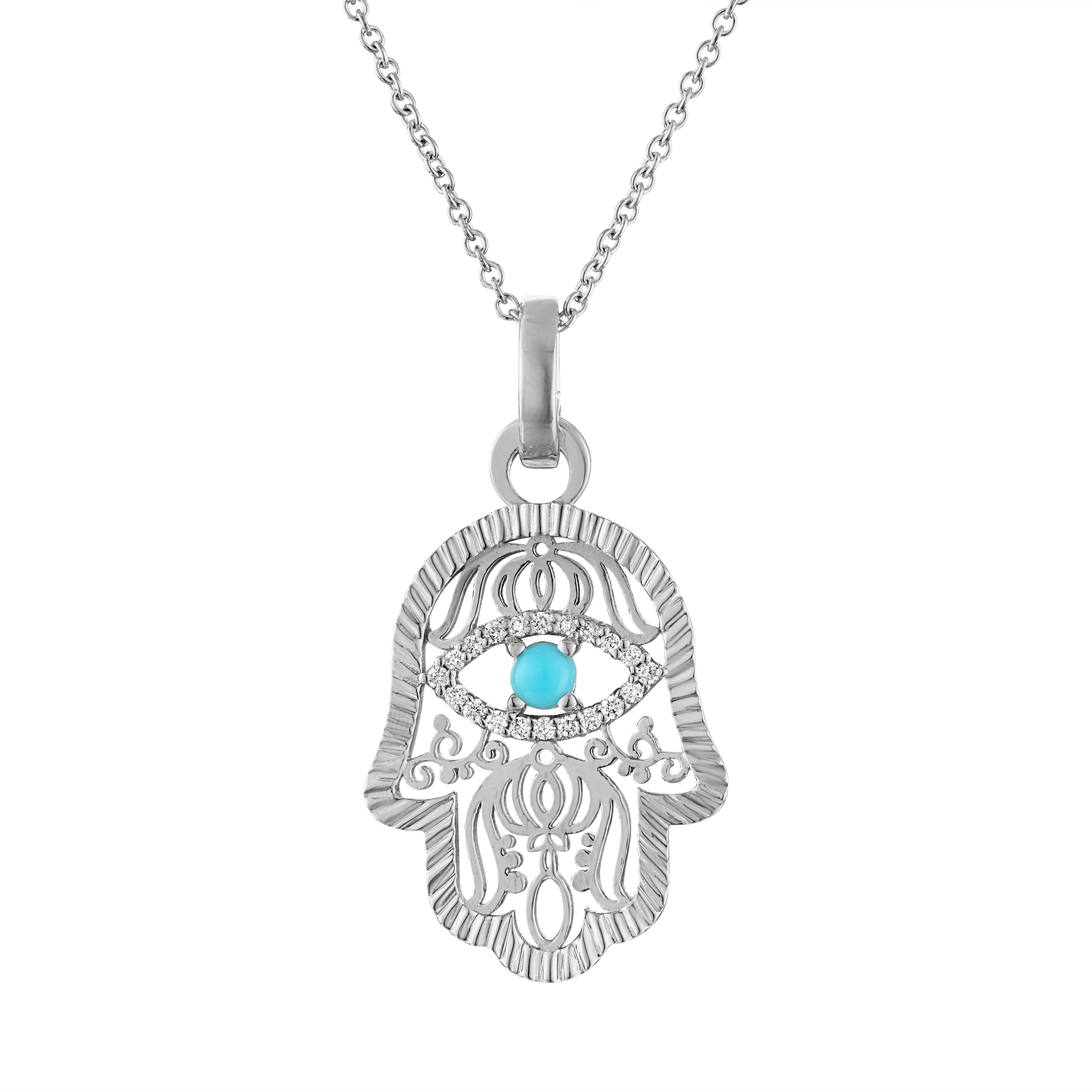 Protection. Peace. Pride. Inspired by heritage and crafted with heart, the Hannah Hamsa Charm Pendant is more than a symbol—it's a story. Rooted in ancient tradition, the Hamsa has long been worn as a powerful token of protection, strength and good fortune. Our version is delicately designed with an inner filigree pattern and our signature fluting around the outside of the piece. The piece is accented with an evil eye, surrounded by pavé diamonds and a turquoise cabochon gemstone for an eye at the center.