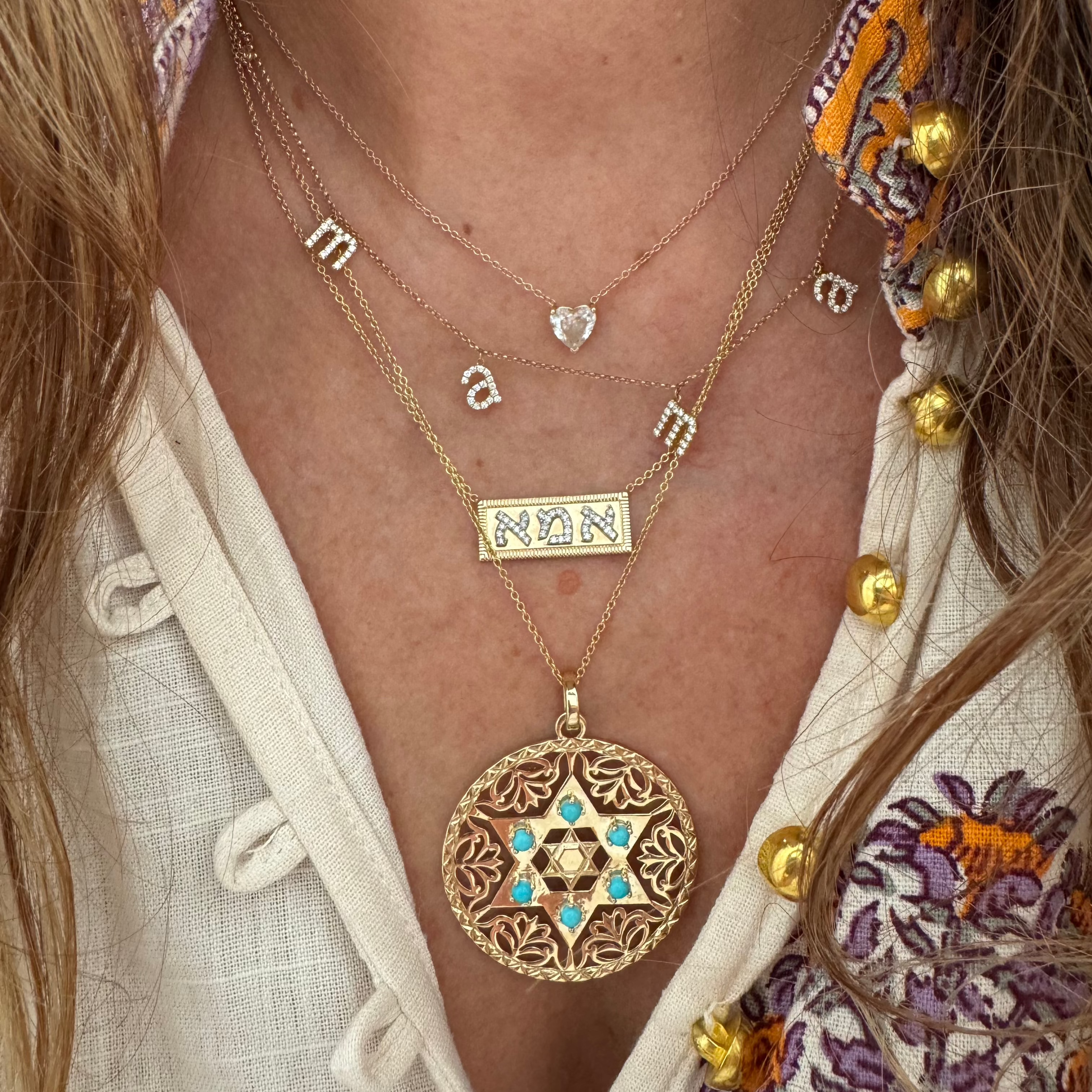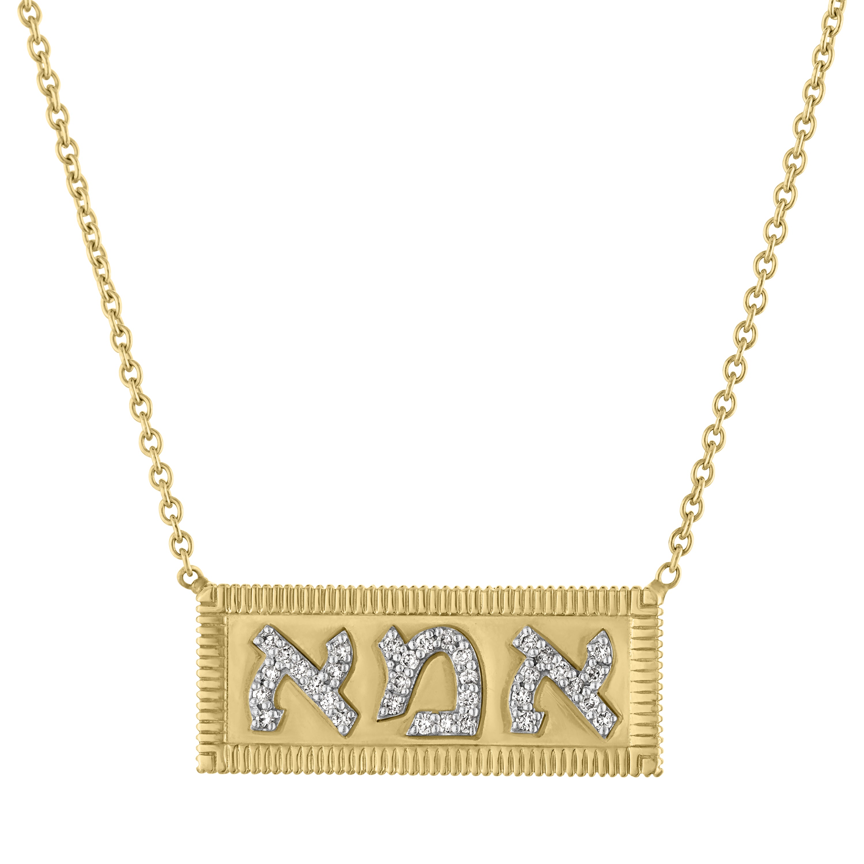 A golden tribute to the heart of the family—Ima. This sleek vertical dog tag pendant honors mothers in the most timeless and stylish way. Crafted in solid gold and engraved with pavé diamonds in the Hebrew word for Mom, this piece is a modern heirloom that celebrates love, strength and legacy.
