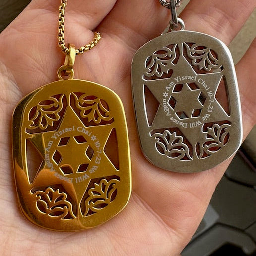 In the very "heart" of this pendant is a smaller Star of David that is delicately engraved. Just like the Hannah, the Jaime also boasts our signature "Am Yisrael Chai, We Will Dance Again, 10.7.23" on the back.