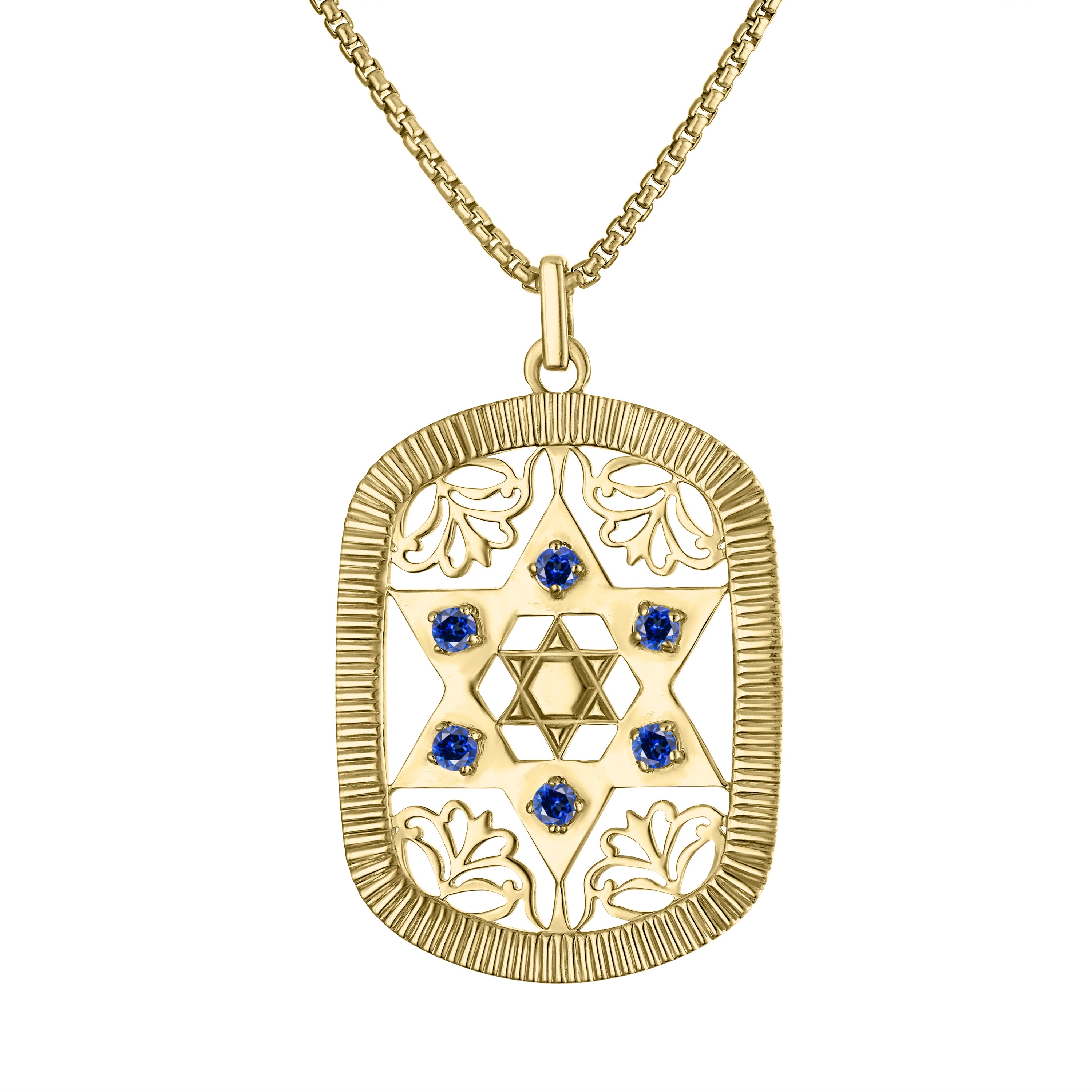 This vintage military inspired, unisex Dog Tag Pendant is a true statement piece, featuring our signature fluting around the outside border and a dazzling Magen David design with six sparkling sapphire blue crystals, either in a silver or gold tone finish.