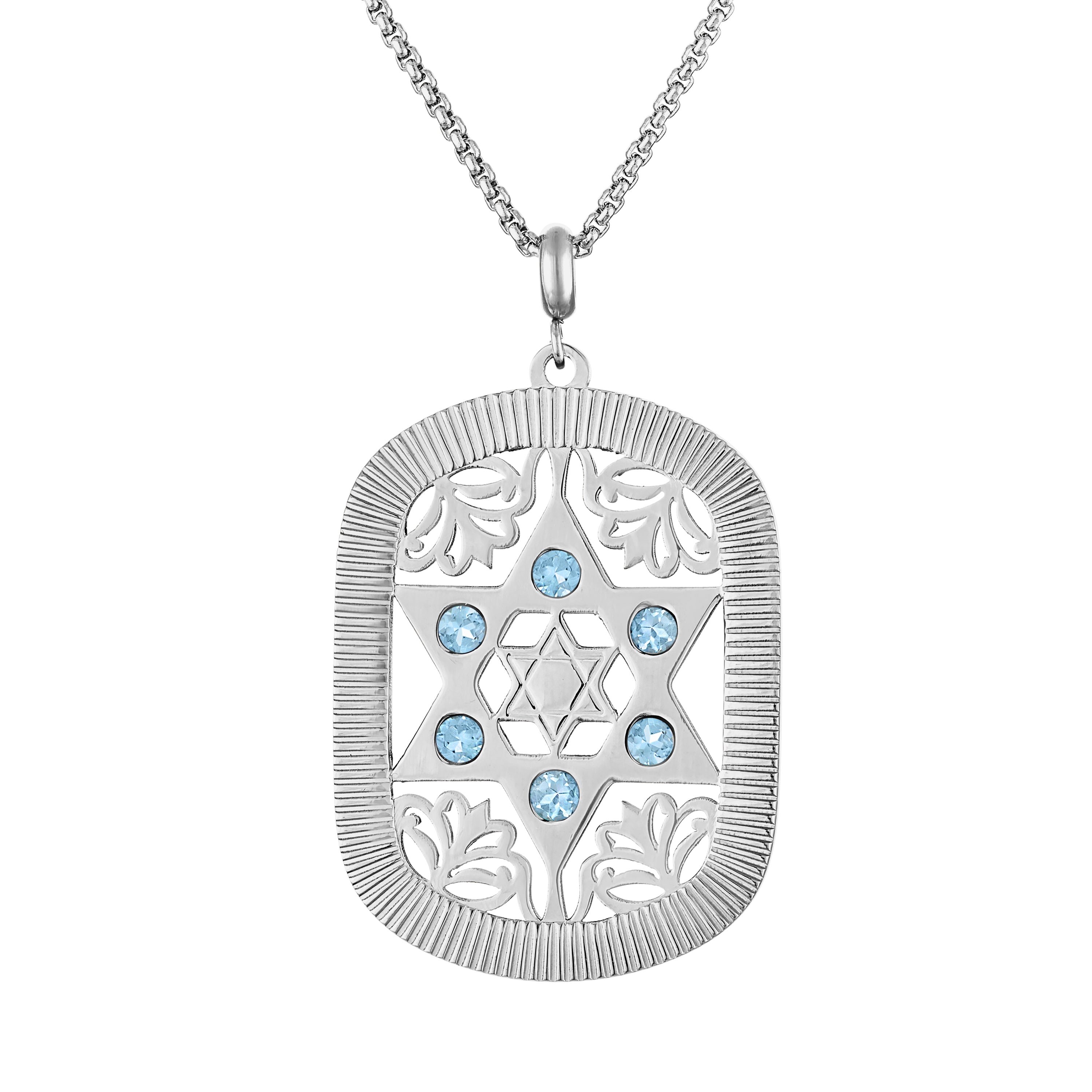 This vintage military inspired, unisex Dog Tag Pendant is a true statement piece, featuring our signature fluting around the outside border and a dazzling Magen David design with six sparkling light blue crystals, either in a silver or gold tone finish.