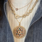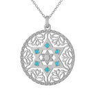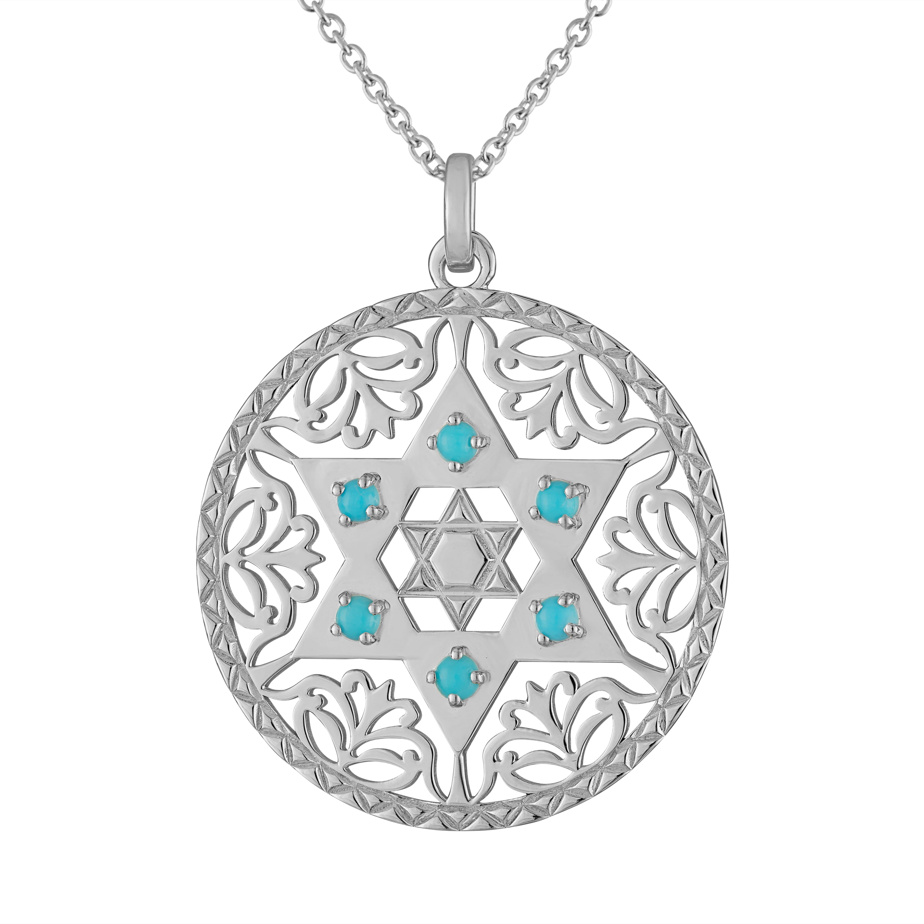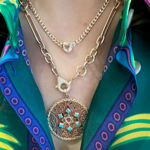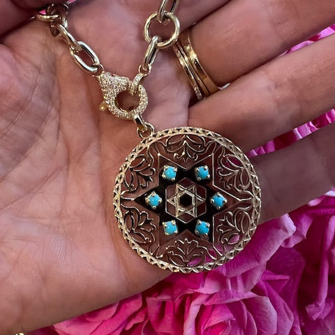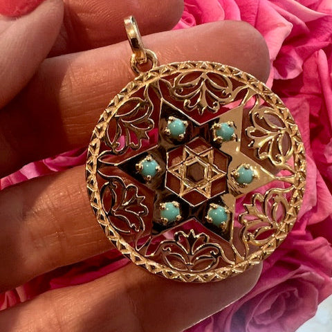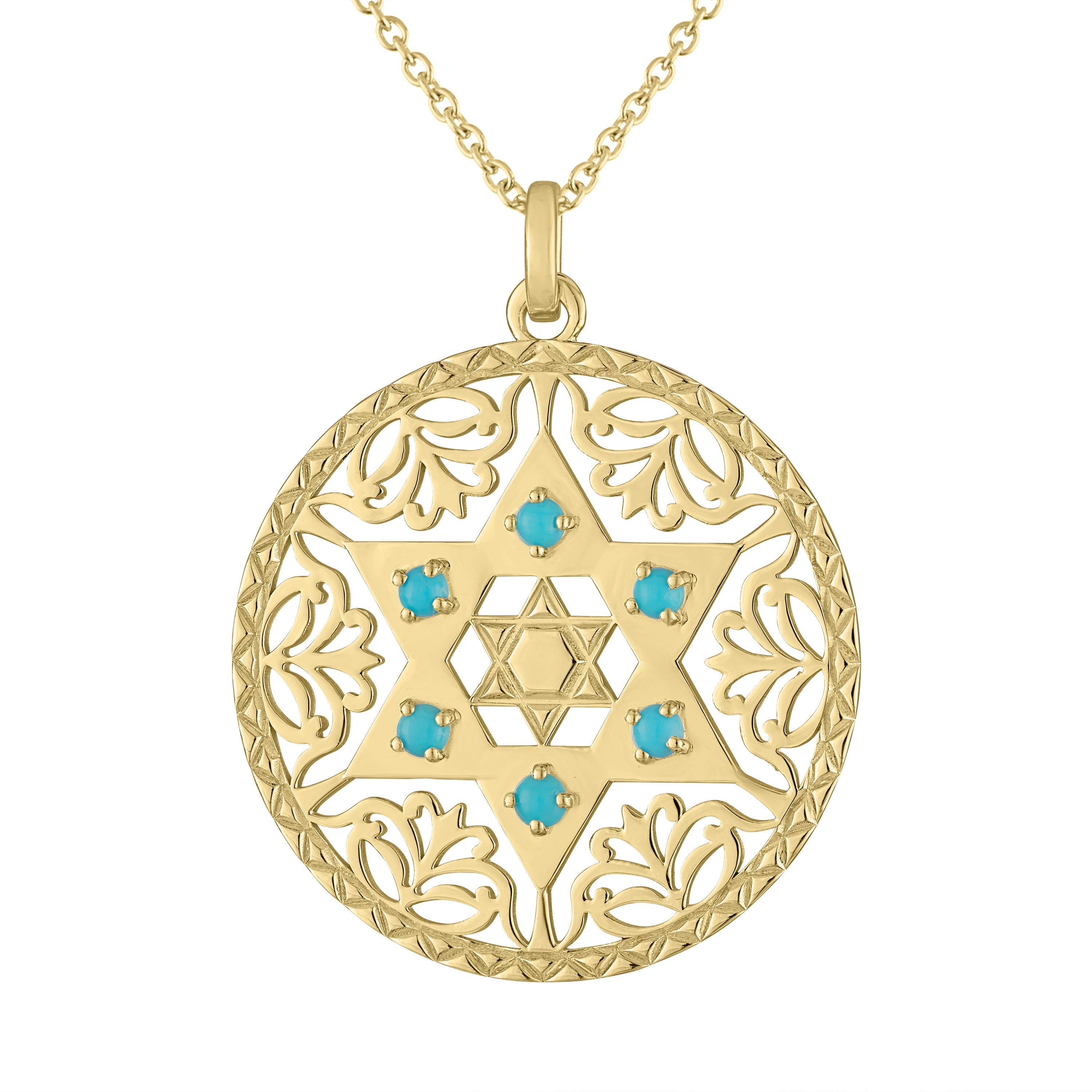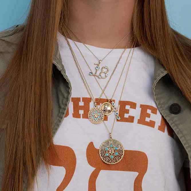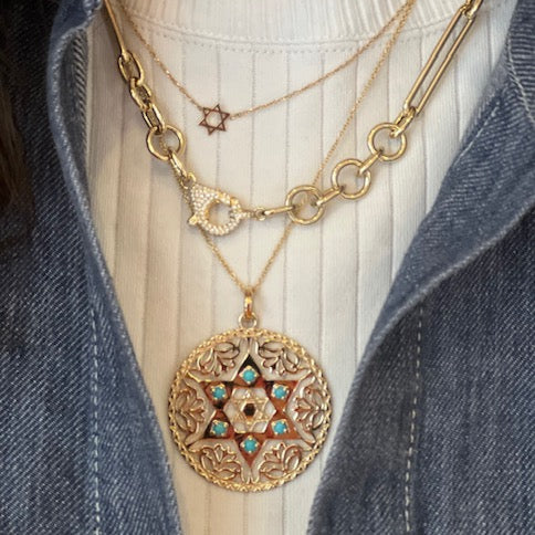 A radiant heirloom of strength, remembrance and Jewish pride. Crafted in luminous 14k gold and adorned with six vibrant turquoise cabochon gemstones, the Hannah Star of David Pendant reimagines a cherished family heirloom passed down to founder Jackie Cohen, by her grandmother Julia.