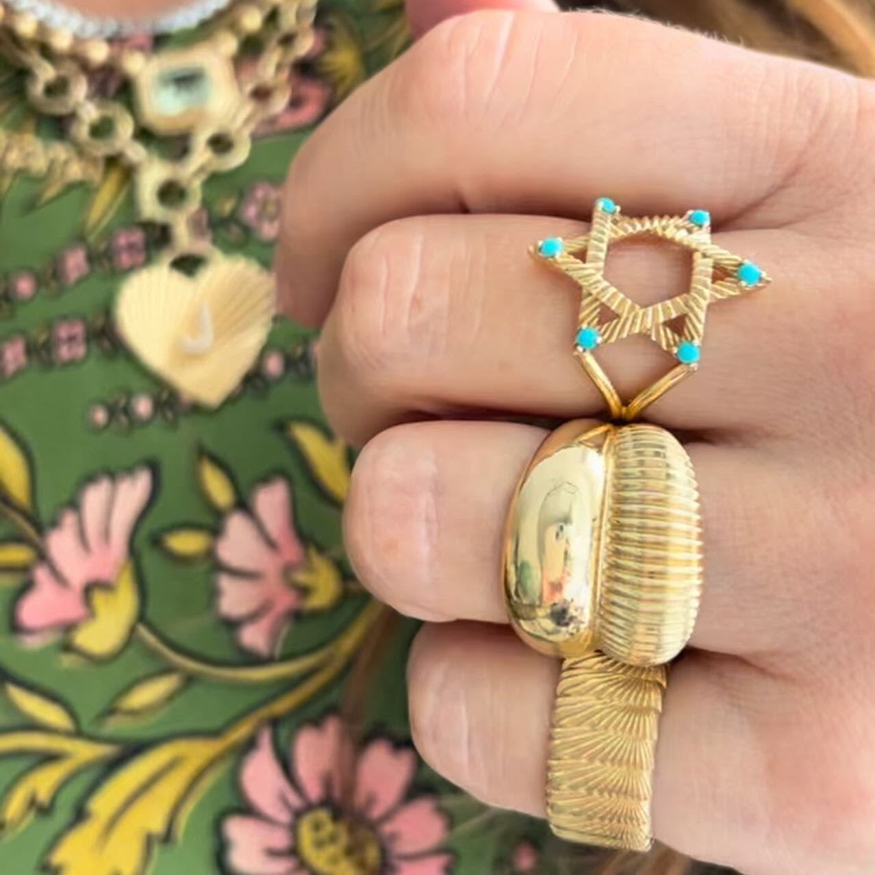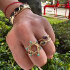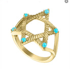 Set at each of the six points of the star are smooth turquoise cabochon gemstones—a vibrant nod to healing, protection, and timeless beauty. Delicate yet powerful, the ring is perfect for stacking or wearing solo as a daily reminder of where you come from and what you stand for.