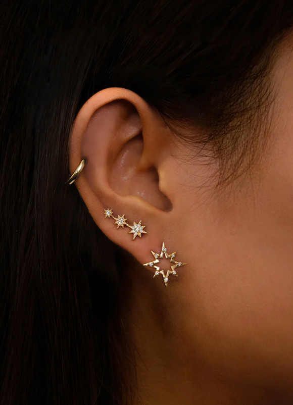 Three pavé set Diamond stars are soldered together and mounted on posts. Inspired by the North Star these shimmering and whimsical ear crawlers add a brilliant touch to both day and evening wear.