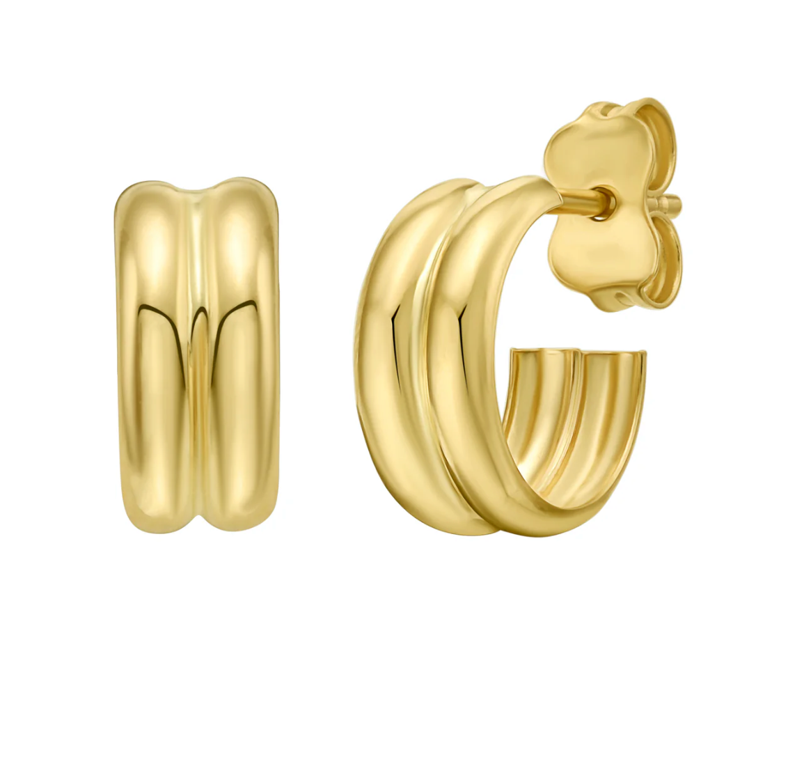 Elevate your everyday look with these bold double-row gold huggie hoops. Featuring a sleek, sculpted design with two rounded bands fused into one chic silhouette, these earrings deliver a modern, dimensional feel while maintaining a timeless appeal. The high-polish gold finish reflects light beautifully, adding effortless shine to any outfit. Perfectly sized for daily wear yet statement-worthy enough for a night out, these hoops are a versatile staple you’ll reach for again and again.