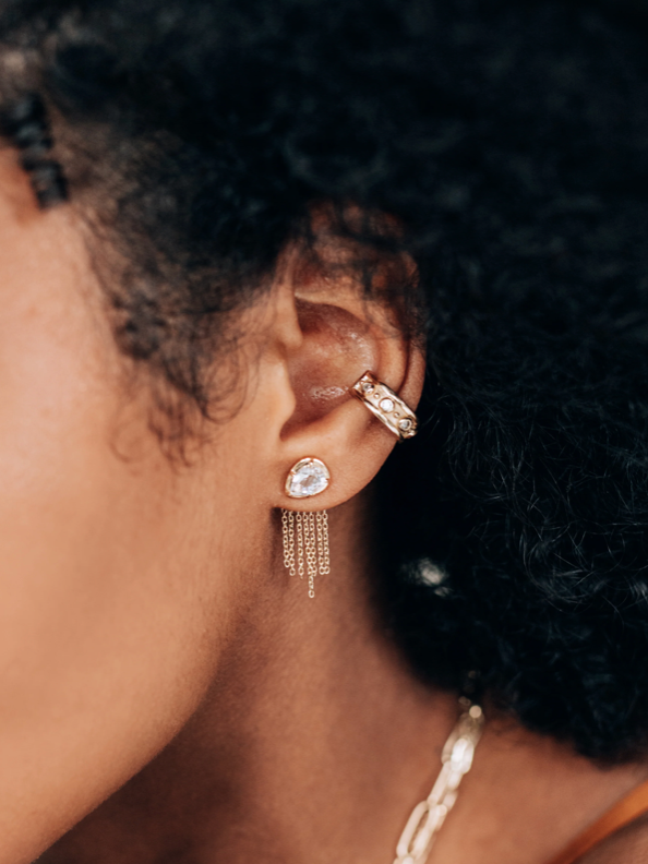 A delicately set topaz pear stone is soldered to a yellow gold post with gold fringe butterfly backs. The fringe backs are a collection of diamond cut chains in a graduated design. This light weight dainty stud can be worn for any occasion.