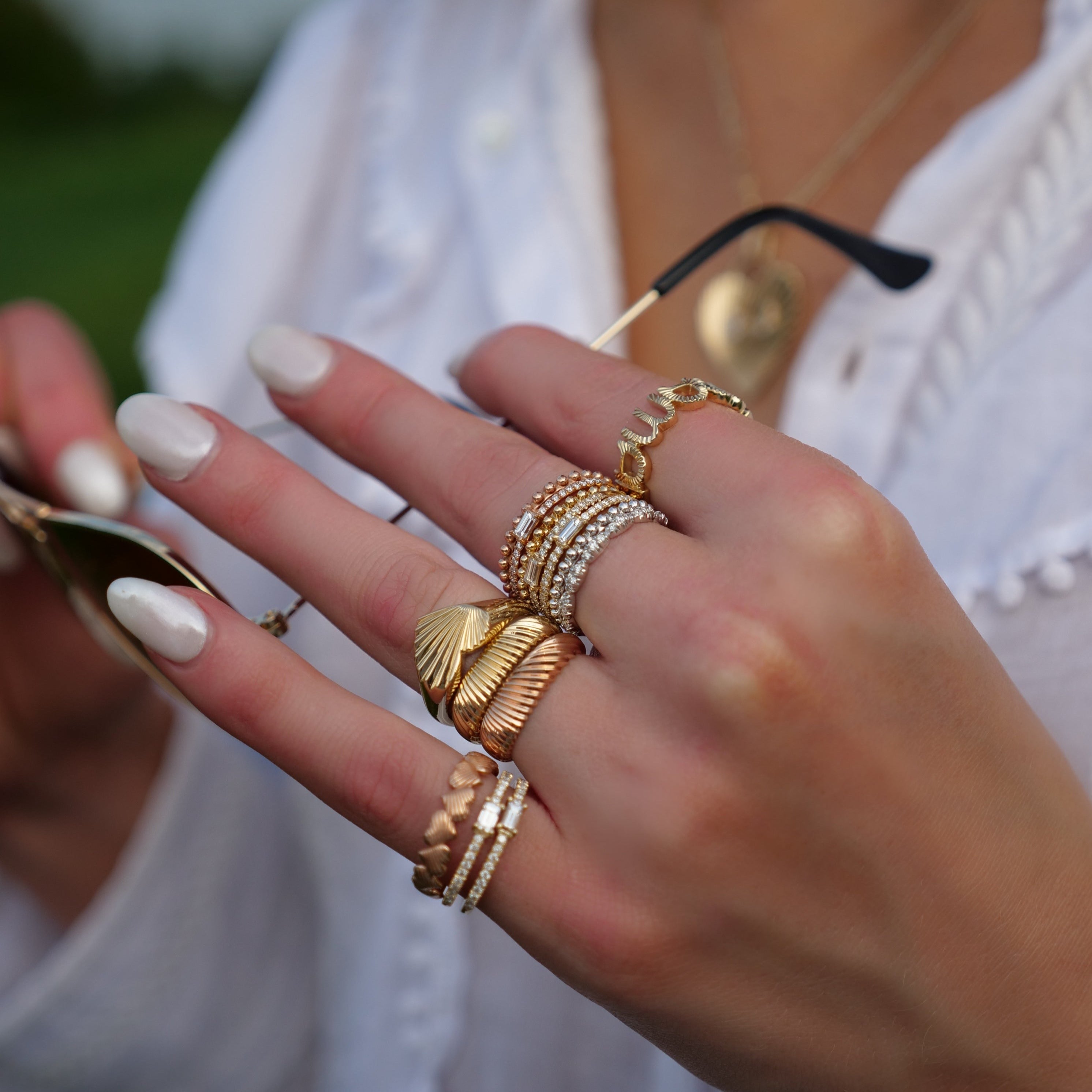 For your everyday look, you'll want a ring that's as timeless as your style. The Fiona Carson band is at the top of our list for its fluted knife edge design, giving your look a modern edge.