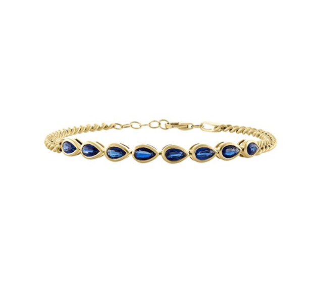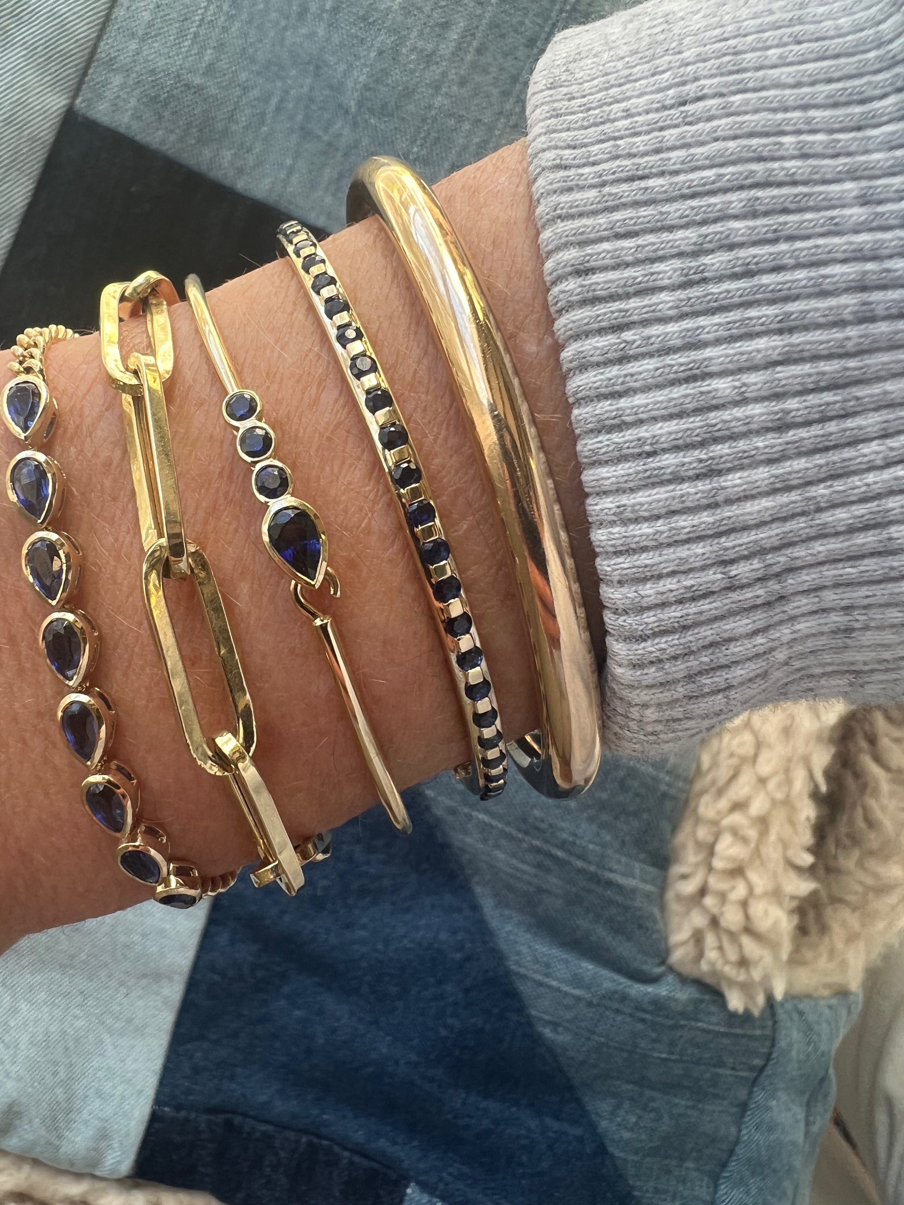 Eight perfectly matched pear-shaped bezel set blue sapphires are perfect to add color to your wrist stack. Adjustable chain to finish the bracelet off make it a perfect fit for almost anyone.
