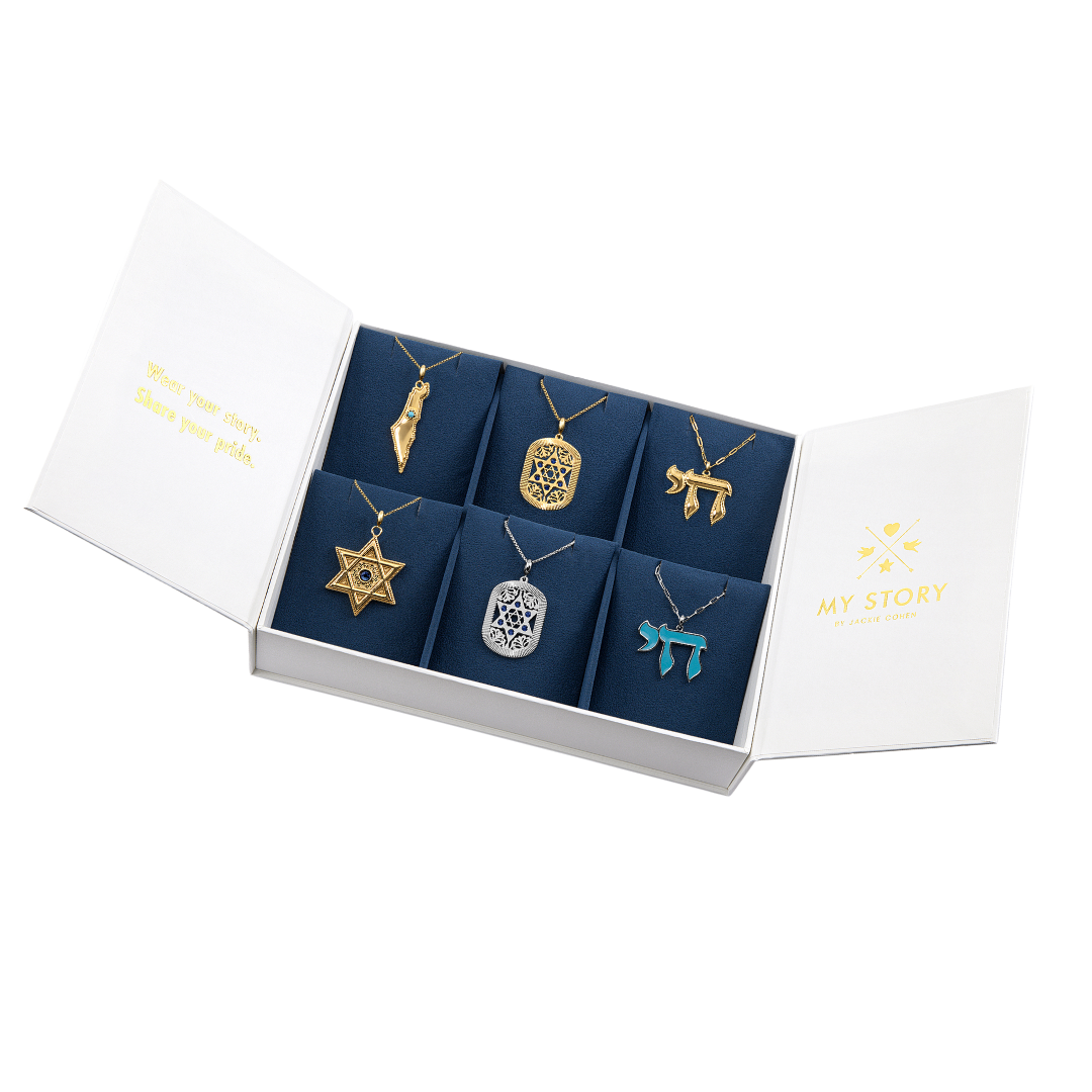 Wear Your Story. Share Your Pride. This Hanukkah, celebrate tradition with meaning and style. Our Limited Edition Hanukkah Gift Box brings together six iconic demi-fine Judaica pendants and four chains, all beautifully presented in a keepsake box.