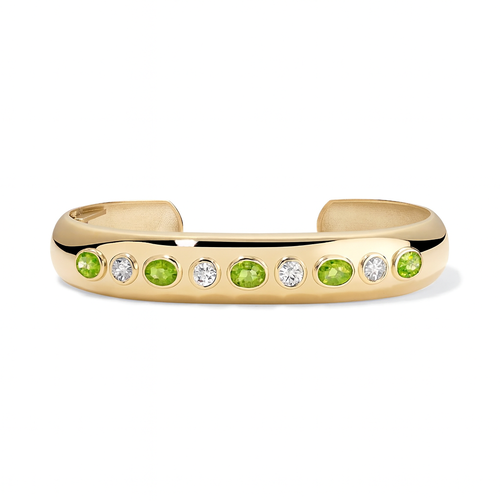 The Gemmy Cuff is a fully customizable, one-of-a-kind piece handcrafted in 14K gold with an innovative invisible hinge for easy, secure wear. It’s designed to reflect your personal story through color, gemstones, and design—no two are ever the same.