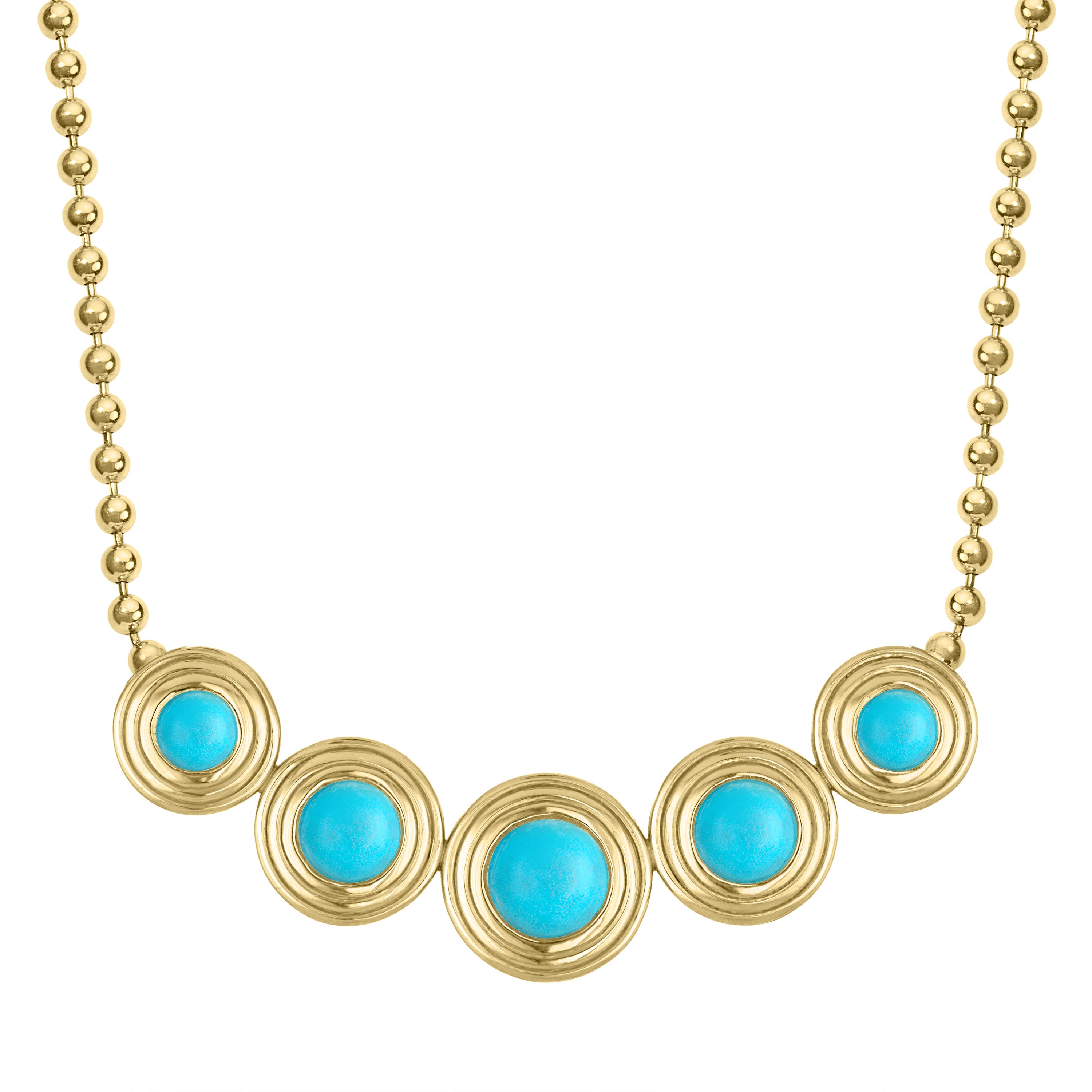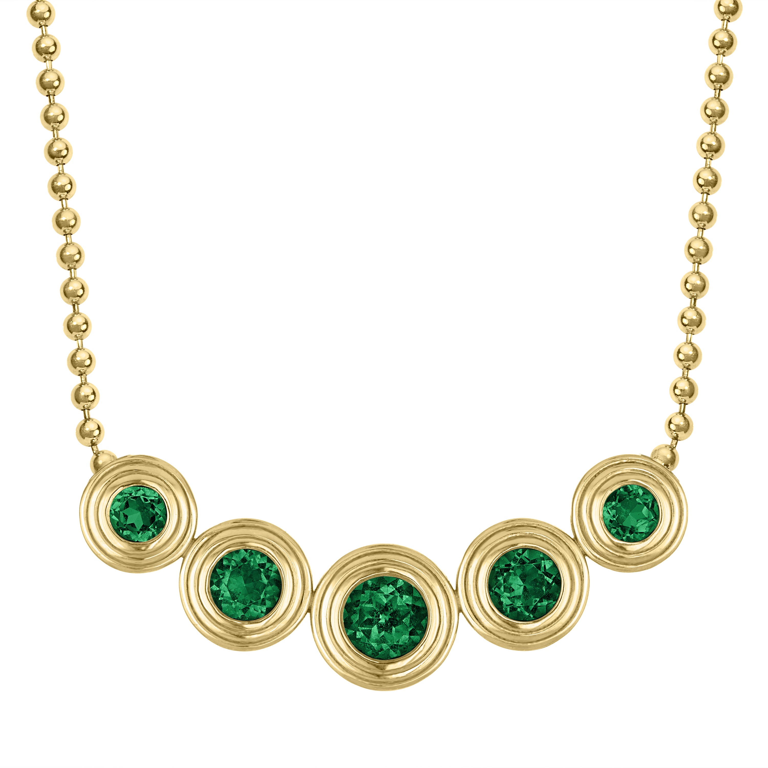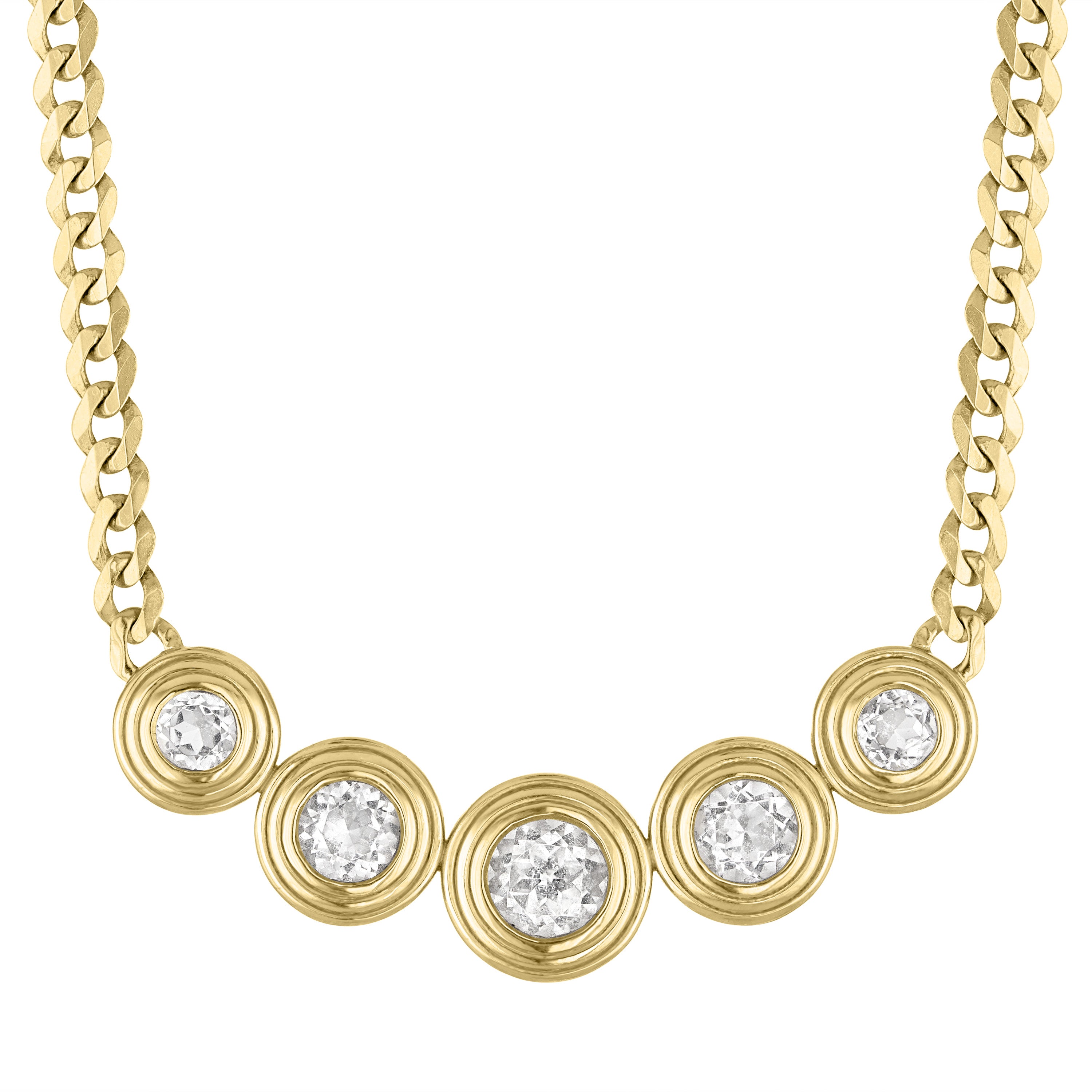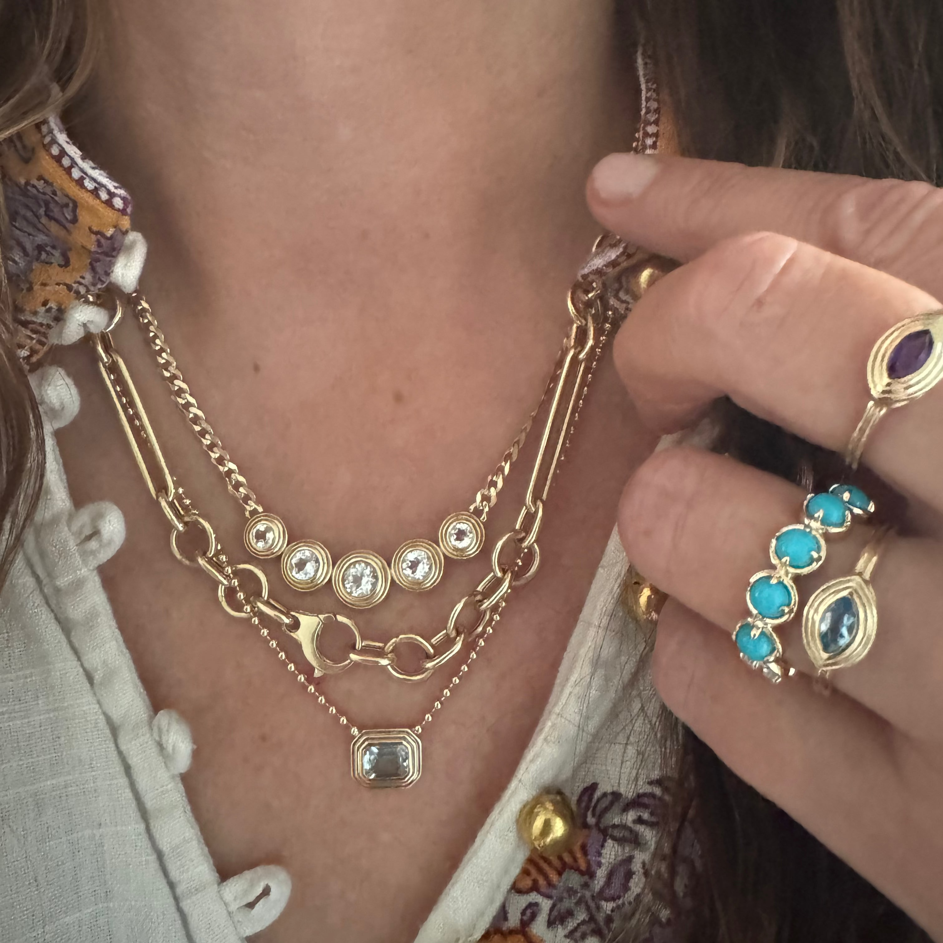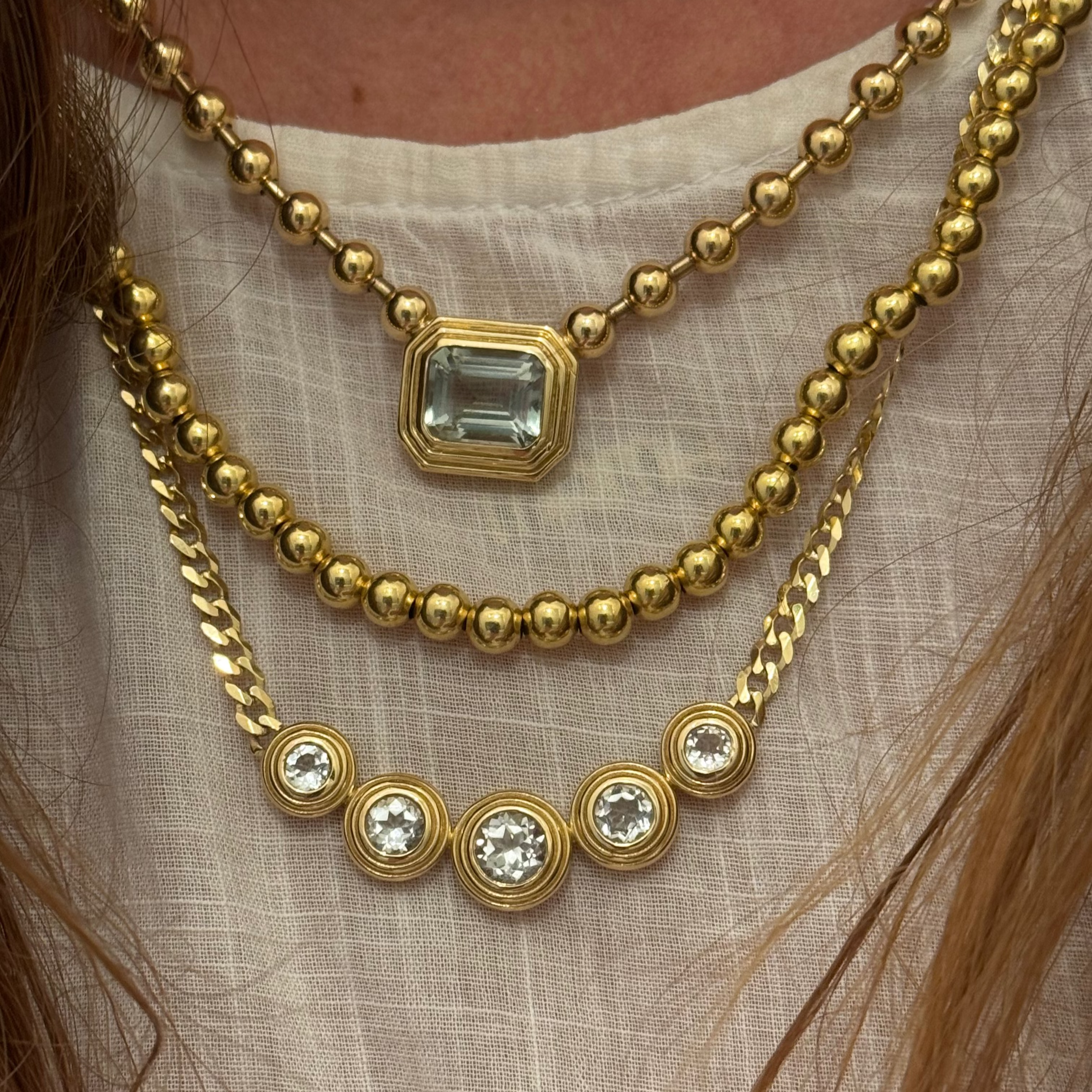 A new MAC Necklace, to round out your neckmess. Elevate your everyday with the MAC Smile Necklace—a modern twist on our beloved MAC Collection that dances gently across your neck like a radiant crescent of light. Five graduated, double-bezel set gemstones float on a polished yellow gold 2.5 mm ball chain. The MAC Smile can also be purchased on an 18 inch, 3.7 mm cuban link chain. Perfect for layering or wearing on its own for a beautiful smile across your neck.