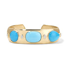 A slice of Southwestern sky for your wrist. The Sonoran Sky Gemmy Cuff mixes hand-selected turquoise in nuanced shades—from robin’s-egg to vivid desert blue—with a constellation of diamonds in varied cuts. Plush cabochons (cushion, round, and pear) are bezel-set in glowing yellow gold, while marquise and round brilliant diamonds glimmer between them like distant stars. The effect is sculptural, luminous and unmistakably My Story.